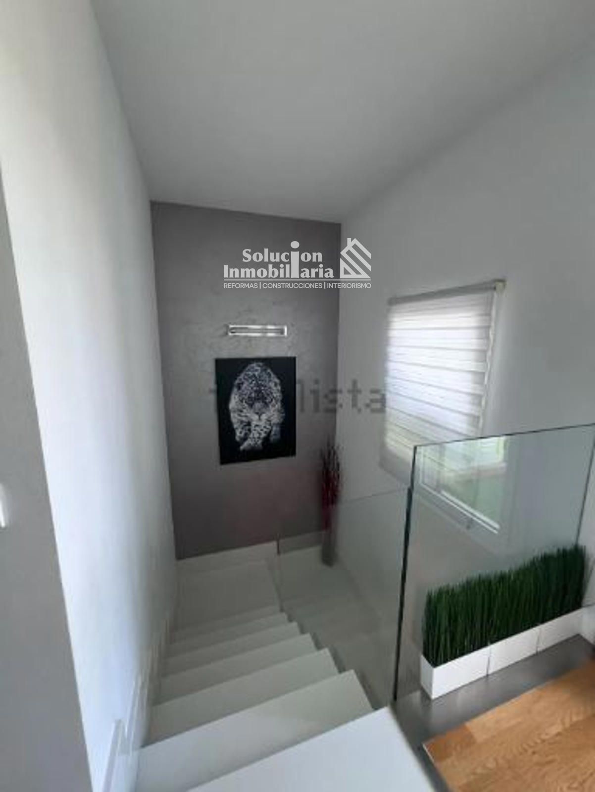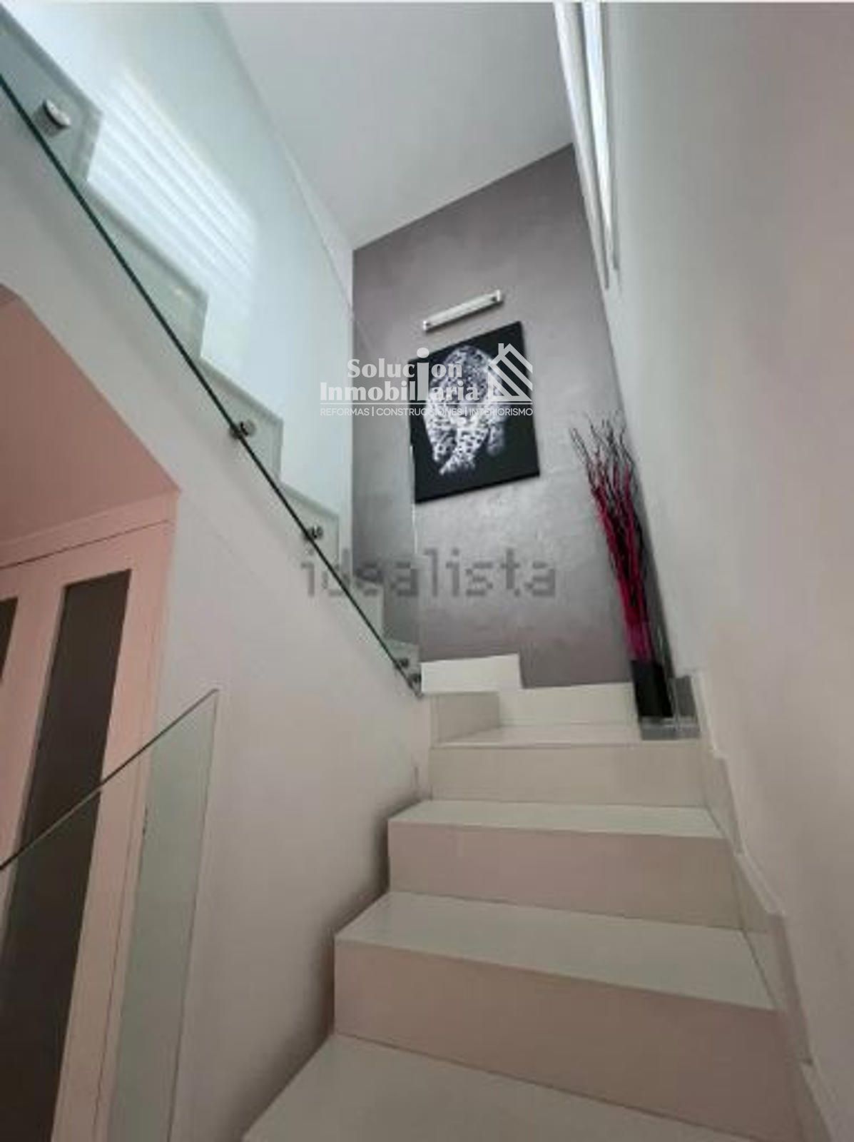 Elegante escalera blanca con barandilla de cristal