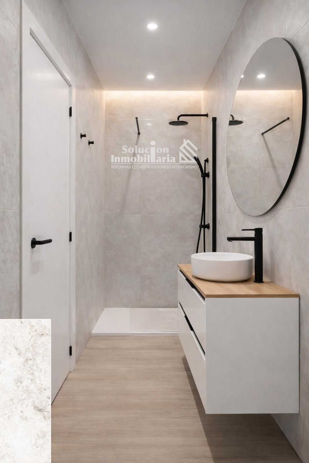 Solería interior: tarima flotante AC5 (Afinsa o similar) o cerámica imitación madera.